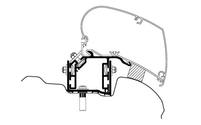 Adattatore adatto per il montaggio sul tetto dei tendalini Thule Omnistor 6300/6200 sul veicolo tipo Volkswagen Crafter dall’anno di produzione 2017.