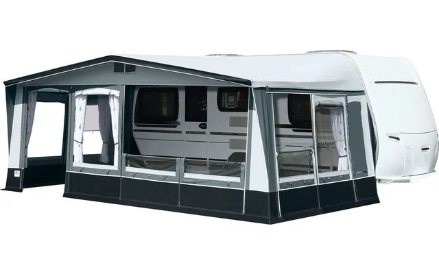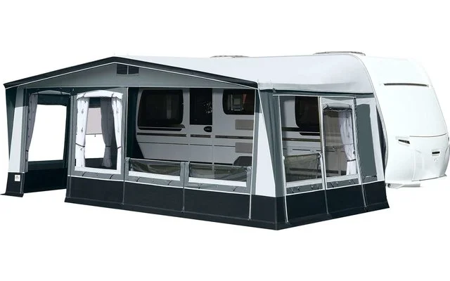 Il Brand Palazzo, questo modello di tenda stagionale e per tutte le stagioni utilizza un robusto materiale di cloruro di polivinile per il tetto e le pareti laterali. La parete anteriore è fatta di tessuto traspirante “Ten Cate”. Posizione d’ingresso liberamente selezionabile grazie alla tecnologia degli elementi della parete anteriore. Ci sono un totale di quattro elementi di finestra per le pareti laterali: due finestre a foglio e due finestre di ventilazione. Questi quattro elementi possono essere posizionati a piacere. Alette delle finestre, copertura di protezione dalle intemperie per le cerniere, una ventilazione ad alto livello con serratura e un palo in tubo d’acciaio da 28 mm con PowerGrip e rinforzo del tettuccio completano l’ampia dotazione di serie.