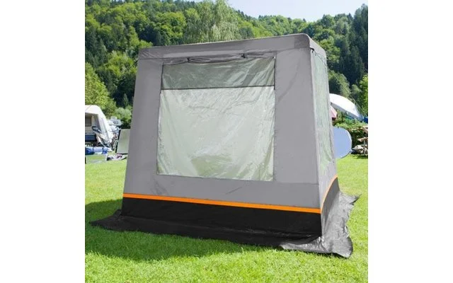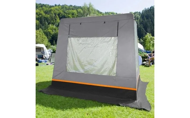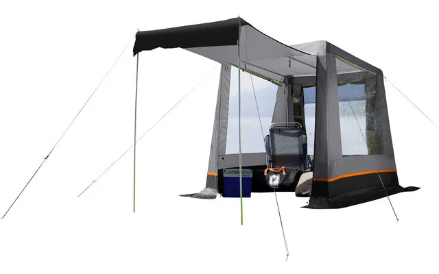 Ventilazione alta bloccabile sulla parete anteriore. L’ingresso può essere aperto come baldacchino per il sole. Ventilazione a garza per zanzare sulla parete posteriore (può essere chiusa dall’esterno). Alette di copertura interne per tutte e tre le finestre.