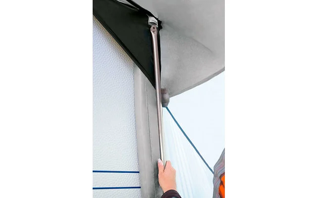 La speciale barra di pressione in combinazione con il cordone di schiuma permette di erigere la tenda sulla parete laterale della roulotte, del furgone o del camper più resistente al vento.