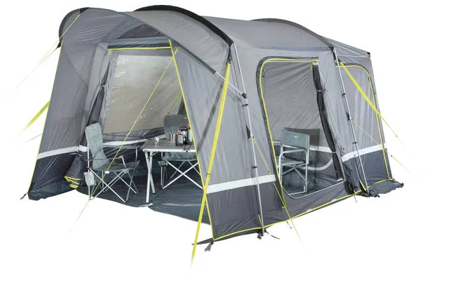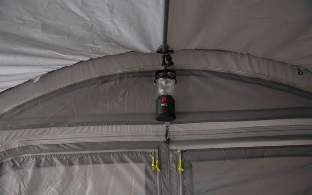 Una presa d’aria alta permette di ventilare la tenda nei giorni di pioggia. Parete posteriore divisibile 50/50 con serratura. L’intera parete posteriore si inserisce nella borsa Easy Stow Away, eliminando il fastidio di arrotolarla. Cerniere extra pesanti con copertura antipioggia per evitare l’umidità. 4 cinghie antibufera regolabili giallo neon e i tiranti sono altamente visibili al crepuscolo. Ingresso cavi tramite cerniera e passaggio cavi per l’illuminazione. Sluice: La saracinesca ha una lunghezza di attacco al tetto di 250 cm e un’altezza di attacco regolabile di 180-240 cm per mezzo di una cerniera e di una cinghia regolabile. 2 porte di camera di compensazione permettono l’accesso al veicolo.