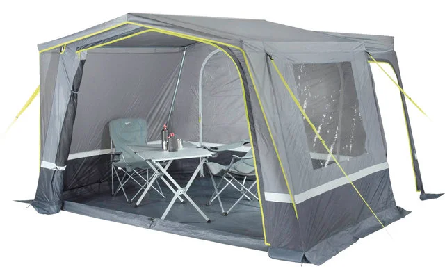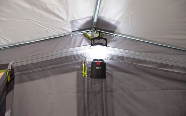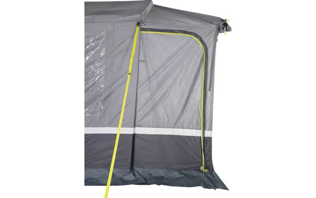 4 cinghie antibufera regolabili giallo neon e i tiranti sono altamente visibili al crepuscolo. La serratura ha una lunghezza di attacco al tetto di 245 cm e un’altezza di attacco regolabile di 180-240 cm per mezzo di cerniere e fettucce regolabili. 2 porte di camera di compensazione permettono l’accesso al veicolo. Il pratico “Drive Away Zip System” permette un facile aggancio e sgancio del veicolo. La tenda è dotata di una guida lampo keder. Tirare il keder nella guida del keder sul veicolo e collegarlo con una cerniera. La serratura può essere arrotolata completamente. Attacco flessibile al veicolo. 1- Palo di blocco dell’orlo cavo con morsetti o corde di ancoraggio.