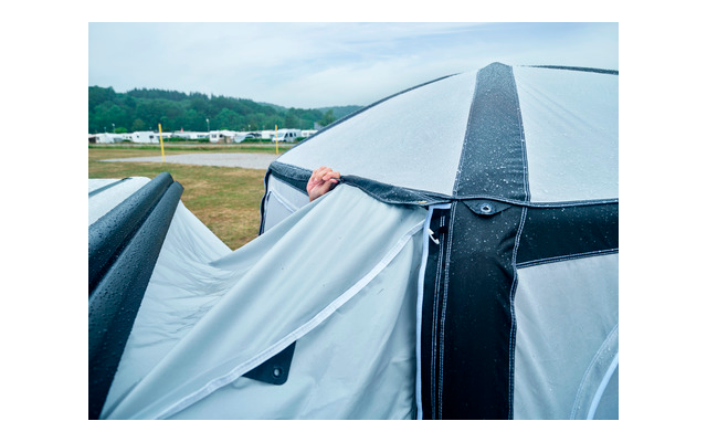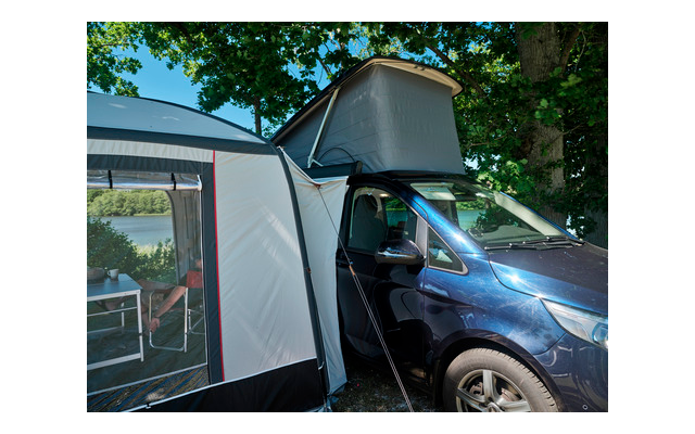 Il blocco di collegamento è collegato alla tenda da sole con una chiusura lampo e può essere sbloccato molto rapidamente, ad esempio per portare il veicolo in gita. La serratura specifica per il veicolo garantisce un’ottima tenuta sul veicolo.