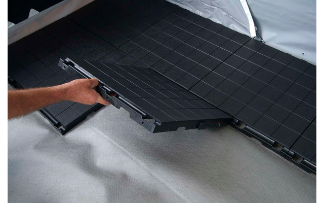 Se si trascorre molto tempo nella propria tenda da sole, è piacevole che il pavimento sia in piano e che la moquette sia liscia. IsabellaFloor offre numerosi vantaggi. È facile da posare senza attrezzi, in quanto gli elementi si inseriscono l’uno nell’altro con pioli di bloccaggio e come un sistema a innesto. È facile da riporre e ha una lunga durata. IsabellaFloor ha anche il vantaggio di poter acquistare smussi e angoli. Questo non solo dà una finitura attraente, ma è anche pratico per le persone in sedia a rotelle e le famiglie con carrozzine, ad esempio.