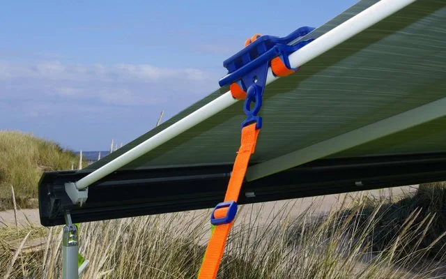 Questo morsetto per tende da sole riduce quasi completamente il fastidioso “sbattimento” del tessuto della tenda da sole causato dal vento. Basta far scorrere il dispositivo di bloccaggio sul lato del telo, posizionarlo sulle travi esistenti o sulle aste a molla, che sono fissate su entrambi i lati della tenda, girare la leva e chiuderla ripiegandola verso il basso. I cuscinetti di bloccaggio trattengono il telo senza danneggiarlo. Il nastro di silicone viene poi teso intorno al palo e agganciato nei fori della griglia corrispondente, a seconda della circonferenza del palo. Compatibile con il tirante per una maggiore stabilità inserendolo nel binario del keder esistente. Può essere attaccato a quasi tutti i sistemi di tende da sole, con pali tondi, ovali o quadrati.