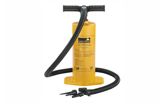 La pompa a doppio sollevamento High Peak ha un flusso d’aria continuo quando viene tirata o spinta ed è ideale per gonfiare e sgonfiare oggetti gonfiabili di grandi dimensioni. La pompa è dotata di raccordi a baionetta, 4 adattatori e un tubo lungo e non attorcigliato. La pompa, con un volume di 2x 2.000 cm³, pesa solo 900 g circa.