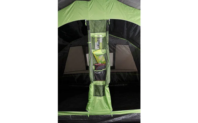 Cerniere extra forti. La copertura con zip è dotata di una grondaia aggiuntiva per la pioggia. La grondaia fornisce un’ulteriore protezione contro la penetrazione dell’umidità. I pioli da terra in acciaio da 5 mm, molto stabili, non si piegano nemmeno su un terreno duro. Le cuciture sono sigillate in modo impermeabile per mezzo di nastro adesivo e garantiscono una migliore resistenza allo strappo delle cuciture. Ingresso cavi tramite cerniera e passaggio cavi per l’illuminazione. Tenda interna oscurata con Vario Vent Control System. 2 entrate a zanzariera tengono fuori i fastidiosi insetti e possono essere comodamente azionate dall’interno a seconda del clima. Una parete divisoria con zip permette di dividere la tenda interna in una grande cabina o in 2 zone notte. 5 pratici organizer e 5 tasche interne per gli utensili. 2 supporti per lampade da campeggio completano il comfort. La Meran 5.0 offre spazio sufficiente per un massimo di 5 persone con attrezzatura da campeggio. Dimensioni esterne compatte e lancio rapido. Ideale per le vacanze in campeggio e il fine settimana in campeggio sul lago.