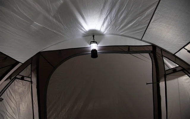 Tenda a tunnel compatta con pavimento cucito che mantiene l’umidità, lo sporco e gli animali striscianti fuori dalla tenda. La zona giorno con 2 metri di altezza offre spazio per le attrezzature da campeggio. 2 entrate a zanzariera ventilano la zona giorno e tengono gli insetti fuori dalla tenda. 3 finestre in pellicola trasparente portano la luce nella zona giorno, le tende proteggono da occhi indiscreti. Il tetto ha un rivestimento in alluminio e riflette il calore. 2 bocchette permanenti ventilano la tenda anche nei giorni di pioggia e dovrebbero essere sempre aperte. La ventilazione High Peak a 3 stadi “Dual Flow” nella zona notte si adatta perfettamente a qualsiasi situazione meteorologica.