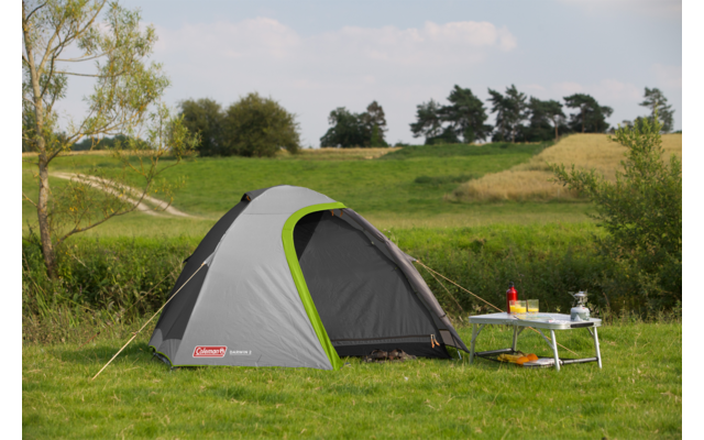La Coleman® Darwin 2 è una tenda a cupola compatta con ampio spazio per i bagagli nel vestibolo.