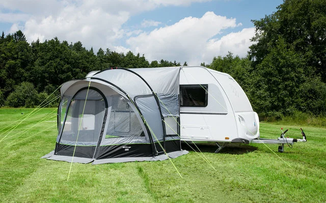 Parete anteriore con il 50% di contenuto di zanzare (può essere coperto dall’esterno), può essere arrotolato di lato. Finestre laterali posteriori con zanzariera e patta di copertura all’esterno. Le finestre rimanenti possono essere chiuse opache dall’interno. Ulteriore ingresso laterale sulla destra. 2 perline di schiuma saldamente cucite per un fissaggio ottimale alla roulotte. Pratico organizzatore all’interno della tenda.