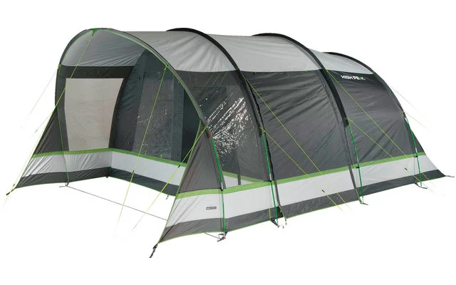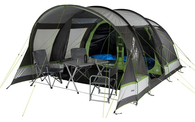 La tenda a tunnel per famiglie con pavimento cucito mantiene l’umidità, lo sporco e gli animali striscianti fuori dalla tenda. Il grande baldacchino con finestra in pellicola trasparente fornisce ombra e protegge dal vento e dalle intemperie. La facciata del portico può essere aperta completamente, a seconda del tempo, per allargare la zona giorno. La zona giorno in 2 m di altezza offre spazio per le attrezzature da campeggio. L’ingresso protetto dalle intemperie ha una grande finestra zanzariera che può essere azionata in modo variabile dall’interno ed è usata come ventilazione permanente. L’ingresso laterale con la porta zanzariera ventila ulteriormente la zona giorno. 2 finestre in lamina trasparente portano la luce nella zona giorno, le tende proteggono da occhi indiscreti. Il pianale anteriore può essere ripiegato con una cerniera ed evita il pericolo di inciampare. Il tetto ha un rivestimento in alluminio ed è termoriflettente.