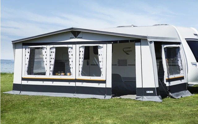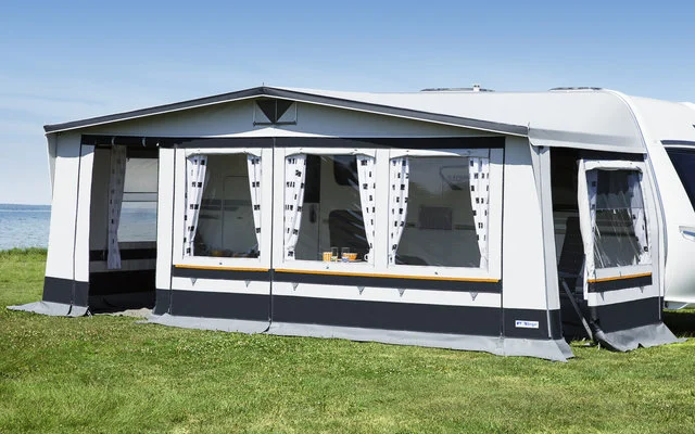- Le pareti laterali sono rimovibili, ognuna con porta che può essere arrotolata lateralmente e finestra di ventilazione 1/2 pellicola, 1/2 garza per zanzare con doppio lembo esterno (lembo di pellicola trasparente per la garza, lembo di tessuto per tutta la finestra)